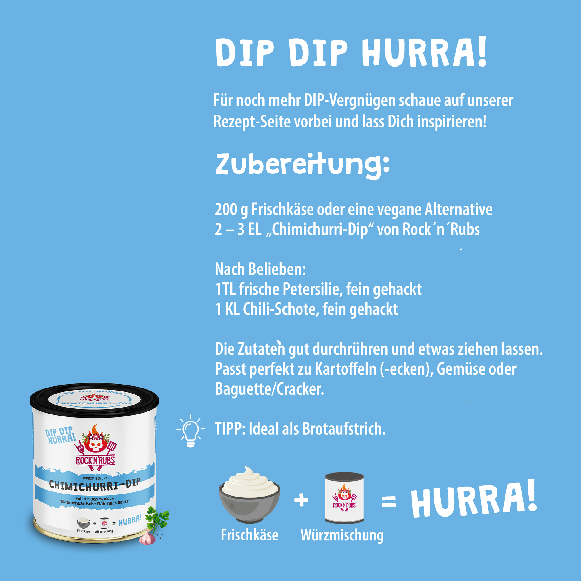 200g Frischkäse oder vegane Alternative mit 2-3 TL „Chimichurri Dip“ verrühren und etwas ziehen lassen. Passt perfekt zu Kartoffeln (-ecken), Gemüse oder Baguette/Cracker